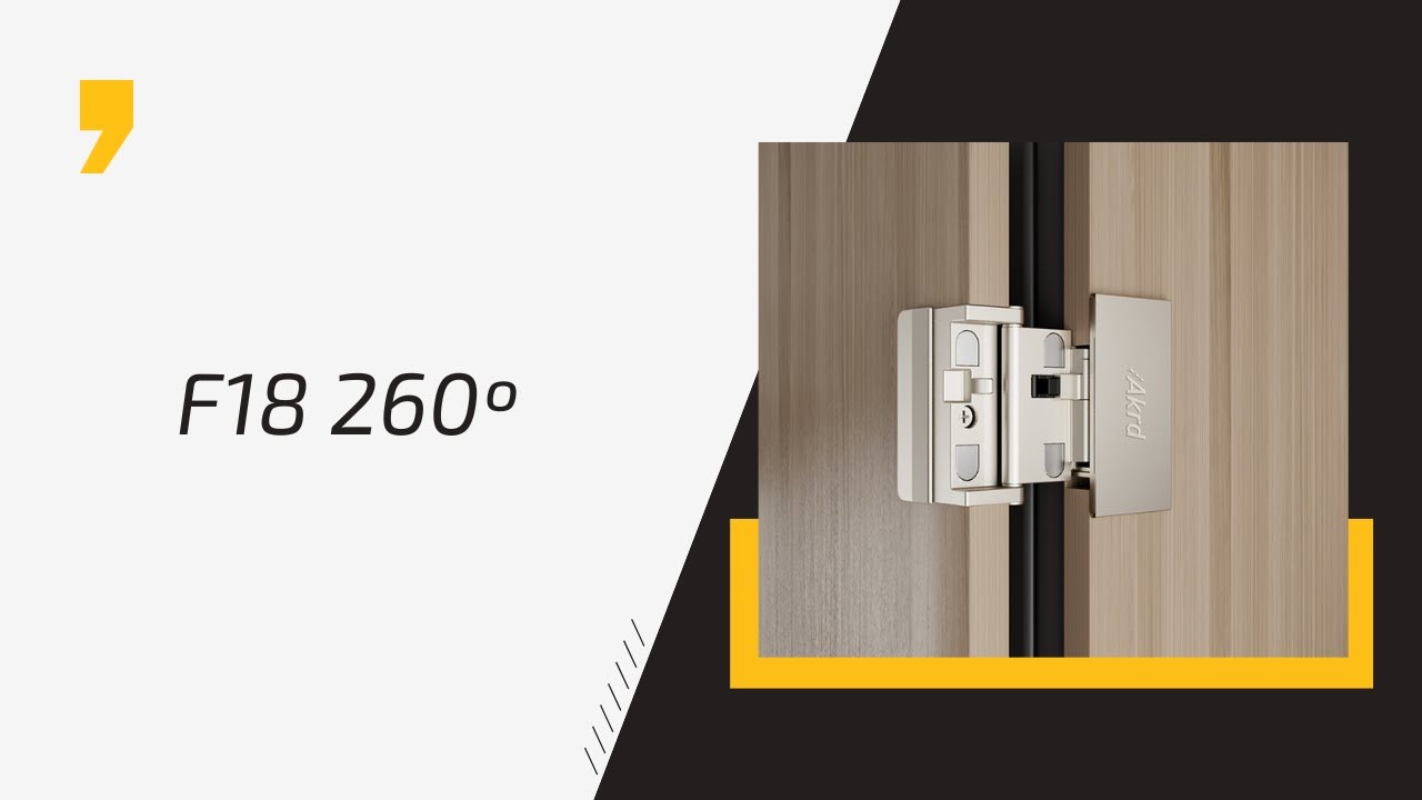 Dobradiça embutida para portas de giro. Destinada para portas de madeira e mdf, a dobradiça F18 conta com sistema de fechamento silencioso e abertura de até 260º. Opções nos modelos reta e curva, para se adequar à sobreposição do seu projeto.